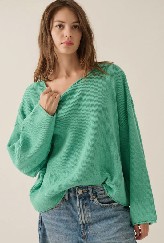 Pine Green Solid Rib-Knit Boatneck Sweater