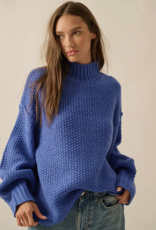 Cobalt Crochet Knit Mock Neck Sweater