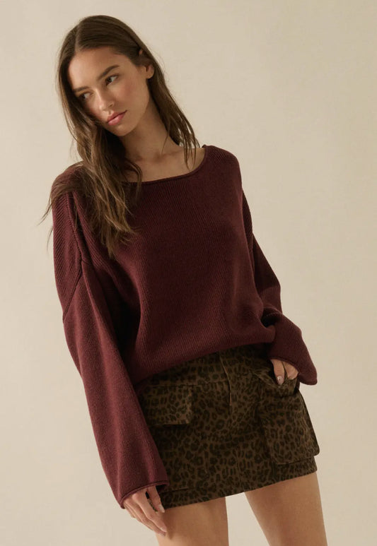 Baked Plum Solid Rib-Knit Boatneck Sweater