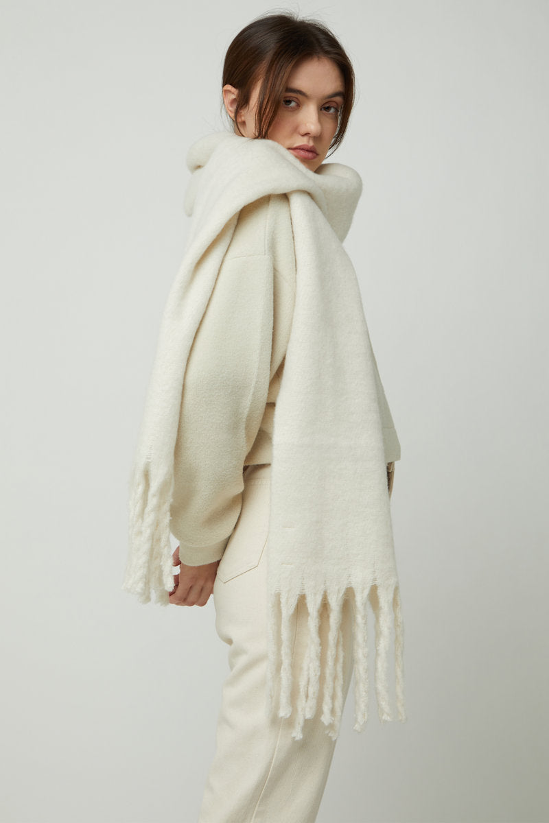 This oversized scarf is a versatile winter accessory made with fringed trims. It will go with all your looks. Style it with both casual and elevated outfits.