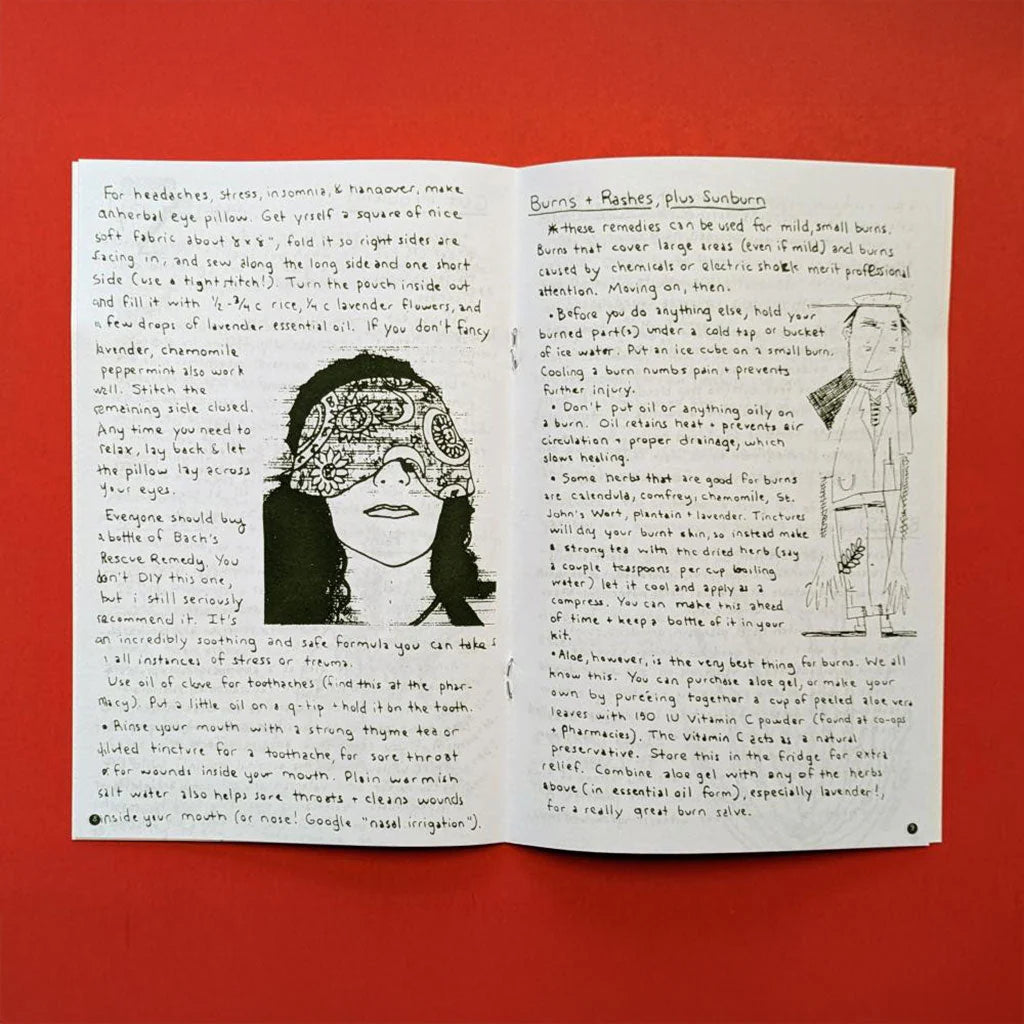 This practical guide to using plants in your environment for their medicinal properties includes a whole host of tips and tricks for tending to your bumps and bruises and keeping yourself healthy. Includes information about healing cuts and scrapes, burns, rashes, sunburns, gut problems, aches & pains, bugs, bruises, bleeding, parasites, and building a first aid kit. Hand written zine with illustrations by Giovanni Caputo.