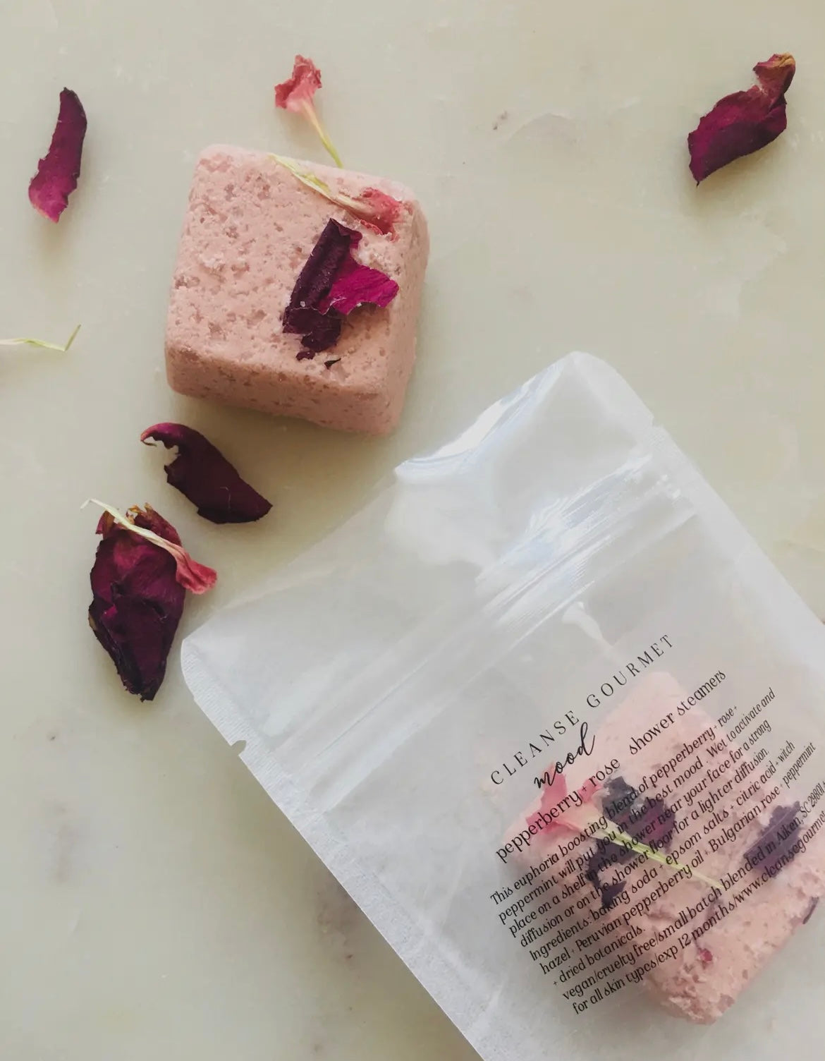 Epsom salts + baking soda + witch hazel + pink rose clay + pepperberry + rose + peppermint + dried botanicals